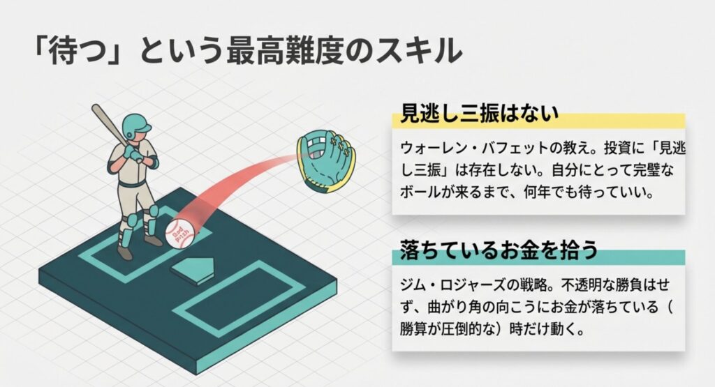野球では、良いボールが来ても見逃せば三振になります。でも、投資の世界は違います。ウォーレン・バフェットの言葉を借りれば、「見逃し三振」は存在しないんです。