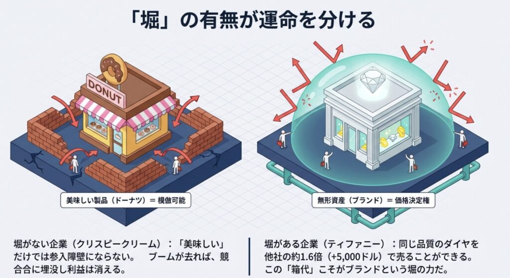 堀がある企業:ティファニー 同じ1カラットのダイヤモンドの指輪が、オンラインの宝石店では8,848ドルで売られているとします。でも、ティファニーでは13,900ドル。5,000ドル以上も高いのに、お客さんは買うんですね。