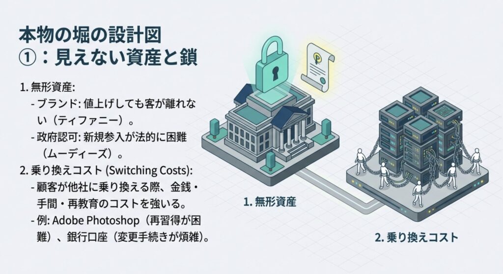 なぜか? あの青い箱、ティファニーのブランドに価値を感じているからです。この「ブランド」という見えない資産が、ティファニーを守る堀になっています。