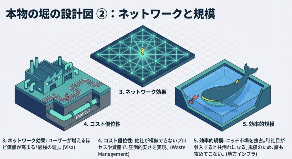 では、どんな強みが「本物の堀」になるのか。パット・ドーシーが提唱する主要な4つのパターンと、それに加えて注目すべき「効率的規模」という戦略を見ていきましょう。