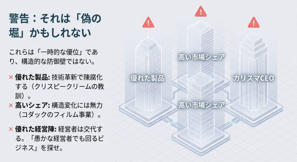 以下の要素は「永続的な堀」にはなり得ません。これらは構造的な強みではなく、努力によって維持されている一時的な優位に過ぎないからです。
