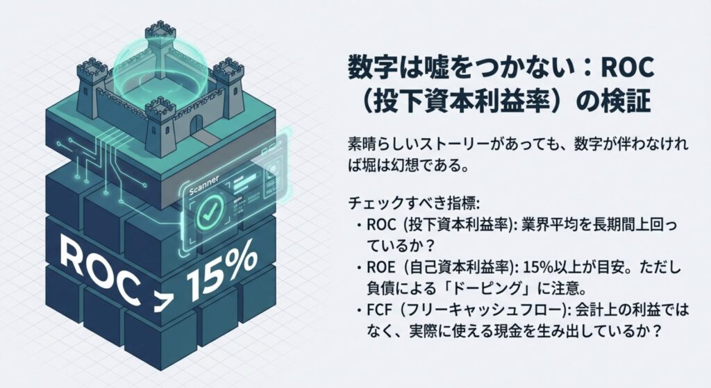 堀が埋まり始めたサインは、真っ先にROC(資本利益率)の低下として数字に現れます。