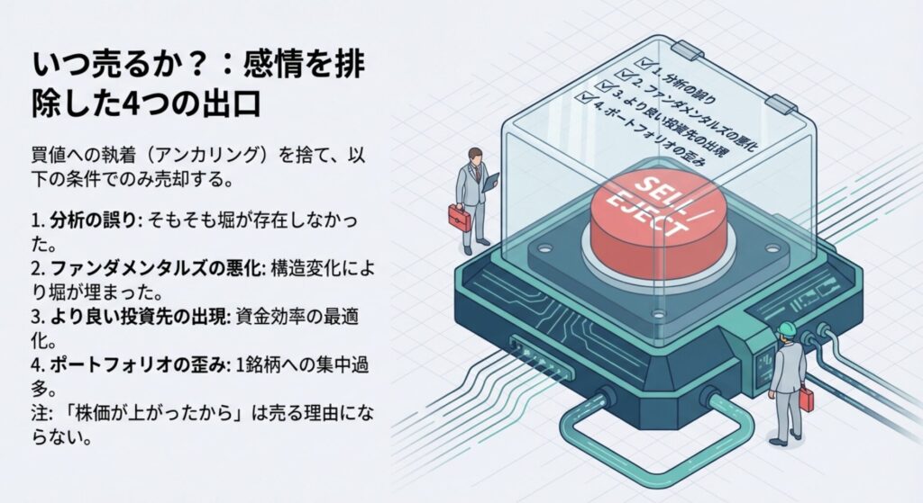 買値への執着(アンカリング)を捨て、以下の条件に該当する場合のみ売却を検討します。