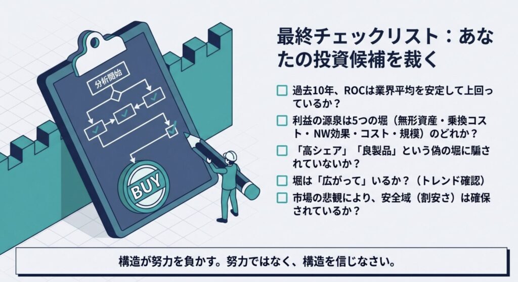 - その利益の源泉は、5つの堀のパターン(無形資産、乗り換えコスト、ネットワーク効果、コスト優位、効率的規模)のどれかに明確に該当するか?
